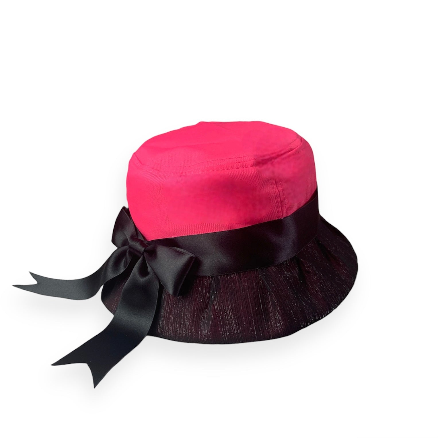 Expertly handcrafted with precision, this bucket hat features a cotton crown, a silk-chiffon brim, and a silk-satin lining complemented by a silk-satin ribbon. Designed in a unique adult size with a 57 cm (10 inch) head circumference, it combines a pink crown with a black brim and ribbon for a distinctive look. To maintain its quality, avoid washing, bleaching, or tumble drying—handwashing is recommended. For safe storage and travel, consider using our W Traveling Bag, specially sized for bucket hats. This piece is crafted to meet the highest standards and deserves careful handling.