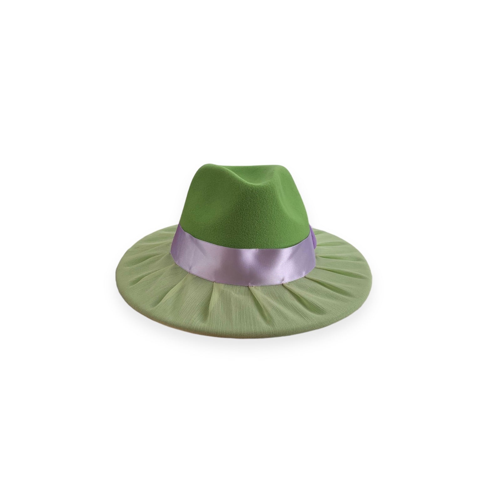 This handcrafted hat is meticulously sewn with premium materials: a polyester crown, a silk-chiffon brim, and a silk-satin lining and ribbon. Sized to fit an adult head measuring 58 cm (approximately 10 inches), it features a green crown, a shimmering green brim, and a lavender purple ribbon. To preserve its quality, we advise using our W Traveling Bag designed for large brim hats during transport and storage. This hat requires delicate handling—avoid washing, bleaching, or tumble drying—and always hold it by the brim to maintain its form.