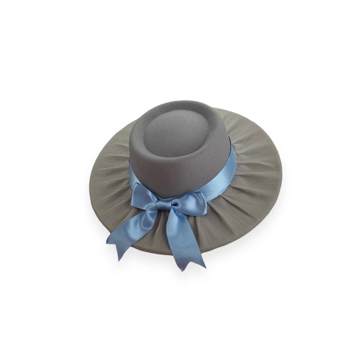 This expertly handcrafted hat features a silk-chiffon brim, silk-satin lining, and a silk-satin ribbon. Designed in a unique adult size with a 57 cm (10 inch) head circumference, it showcases a grey crown, a sparkling grey brim, and a light blue ribbon. To maintain its quality, we suggest using our W Traveling Bag for large brim hats during travel and storage. Please handle with care: avoid washing, bleaching, or tumble drying to preserve its exceptional craftsmanship.