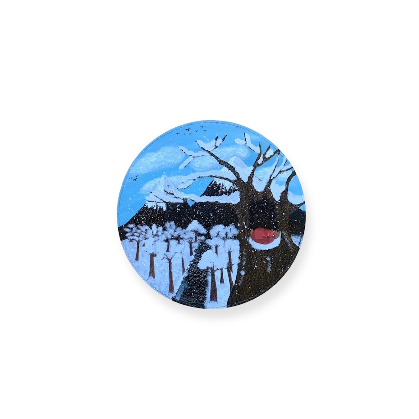 Handcrafted masterpiece perfect for storing your cozy winter hats. This exquisite hat box features a feeling of hibernation inside your home with a warm cup of hot beverage looking outside the window at the snow falling on the mountains. A hand-painted designs that evoke the serene beauty of the winter season. The interior is luxuriously lined with satin, providing a soft and protective environment for your cherished hats. Made with care and attention to detail, this is a beautiful and functional way to store your favorite winter accessories.